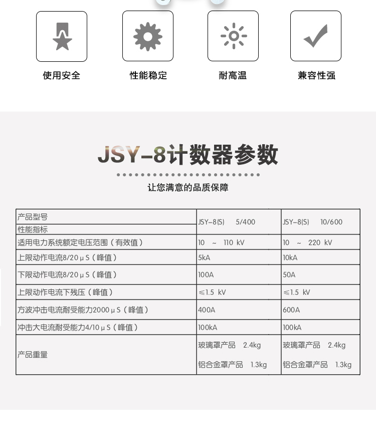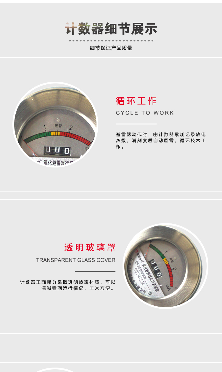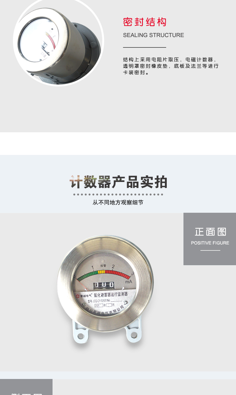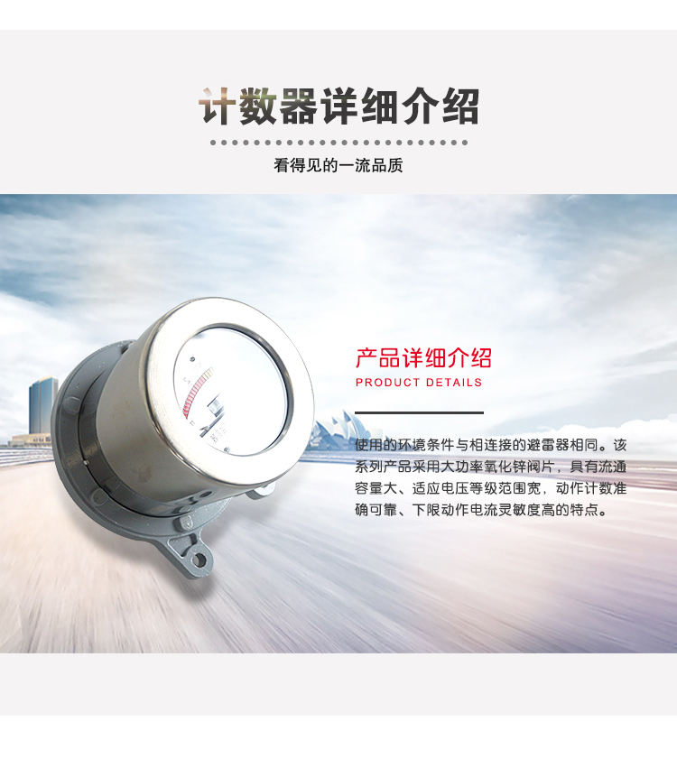 JSY系列放电计数器适用于330kV及以下电压等级的各型碳化硅和氧化锌避雷器,使用的环境条件与相连接的避雷器相同。该系列产品采用大功率氧化锌阀片,具有流通容量大、适应电压等级范围宽,动作计数准确可靠、下限动作电流灵敏度高的特点。