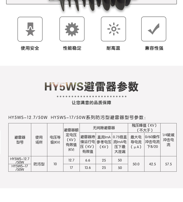 HY5WS-12.7/50W HY5WS-17/50W系列防污型避雷器型号参数: